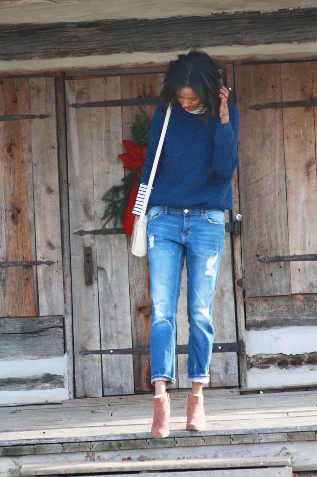 I got this sweater three years ago as a birthday present and actually thought about donating it this past spring, but I am so glad I did not. When I put it on this winter I really loved the color and the way it fit. It's to short to wear with legging so I usually opt to just tucking it in with jeans. Lets just take a moment to talk about boyfriend jeans! If you do not own a pair keep looking because once you find the perfect pair it feels like you are wearing sweatpants. I own like 50 and I am always on the hunt for more idk what it is about them but they go with everything. Whenever I'm at work and people are on the hunt for boyfriend jeans I give them two tips. 1) If you feel like your normal size is to tight on you size up. They are suppose to give an over size look. 2) Make sure you are wearing them low enough on your waste.